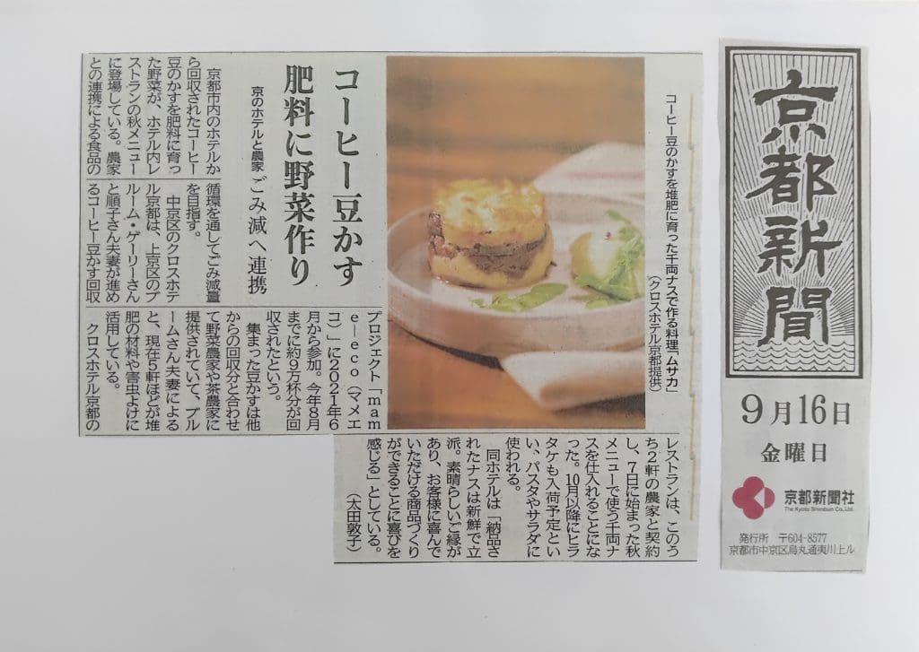 先日京都新聞の朝刊にクロスホテル京都のレストランKIHARUにてコーヒーかす栽培で育った野菜やキノコが秋メニューに加わるという素晴らしい記事が紹介されました。