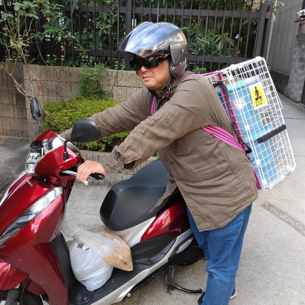 自作のバケツキャリアを使用し、バイクでたくさんのコーヒーかすを毎週末、活動拠点に運んできてくれます。