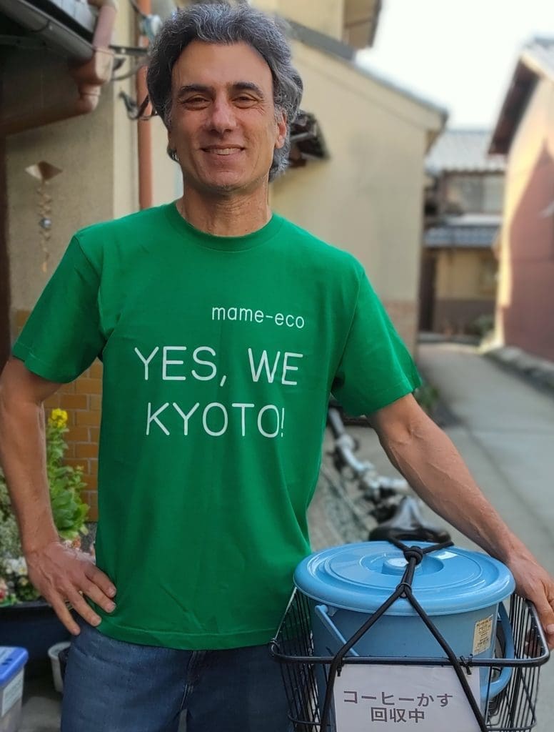長年にわたる京都市の環境に対する精力的な取り組みが、2020年にmame-ecoコーヒーかす再利用プロジェクトを開始するきっかけとなりました。メルケル首相の質問に答えたかったので、Tシャツと自転車の掲示サインを作りました。